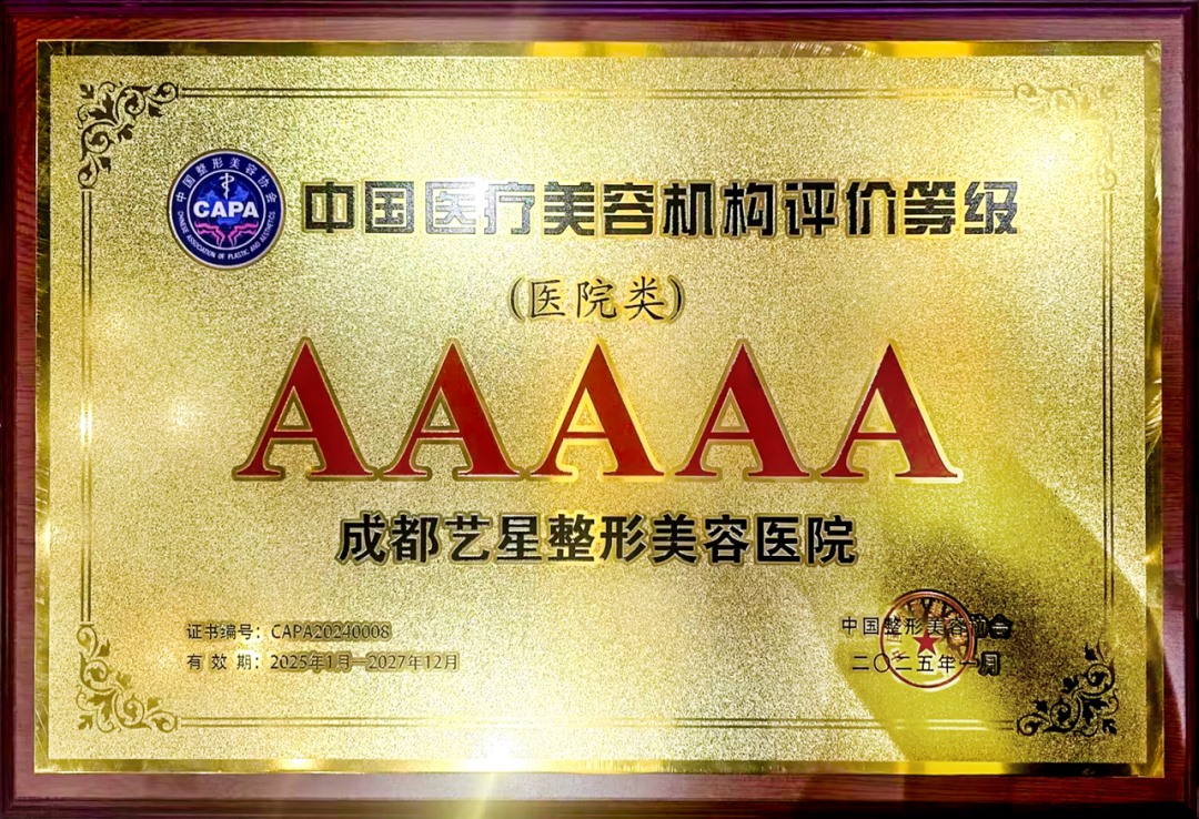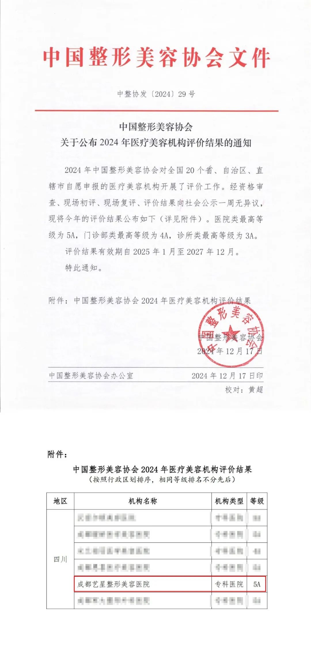 2024年12月,中国整形美容协会正式公布了2024年医疗美容机构评价结果,成都艺星整形美容医院再度荣膺国家5A级医疗美容机构,这是成都艺星连续两届蝉联该殊荣。