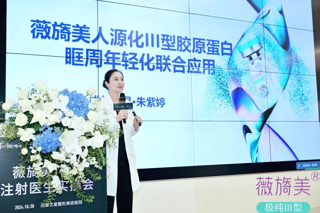 本次交流会,围绕着A型人源化III型胶原蛋白的联合应用展开。成都艺星皮肤科院长朱紫婷作为本次实操会的胶原带教导师带来了《A型人源化川型胶原蛋白眶周年轻化联合应用》的课题讲解,从眶周衰老机制、表现、诊疗等方面进行了详细的剖析分享。