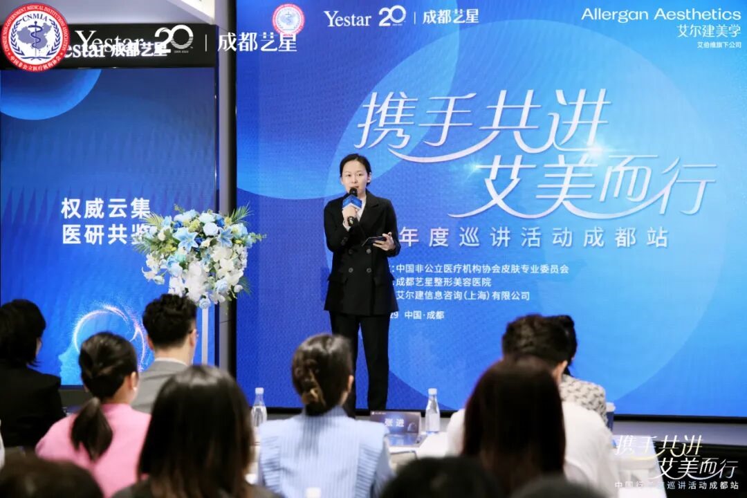 随后,艾尔建美学销售副总监程亚西女士在致辞中表示:“艾尔建美学作为全球医美领域的先行者,长期致力于与行业伙伴携手,推动中国医美生态的健康发展。‘艾美而行’系列活动的开展,正是这一承诺的体现。我们非常高兴能与成都艺星这样具有专业实力和行业担当的机构合作,相信通过今天的思维碰撞,能够进一步激发创新,规范临床实践,最终让更多求美者获益。”