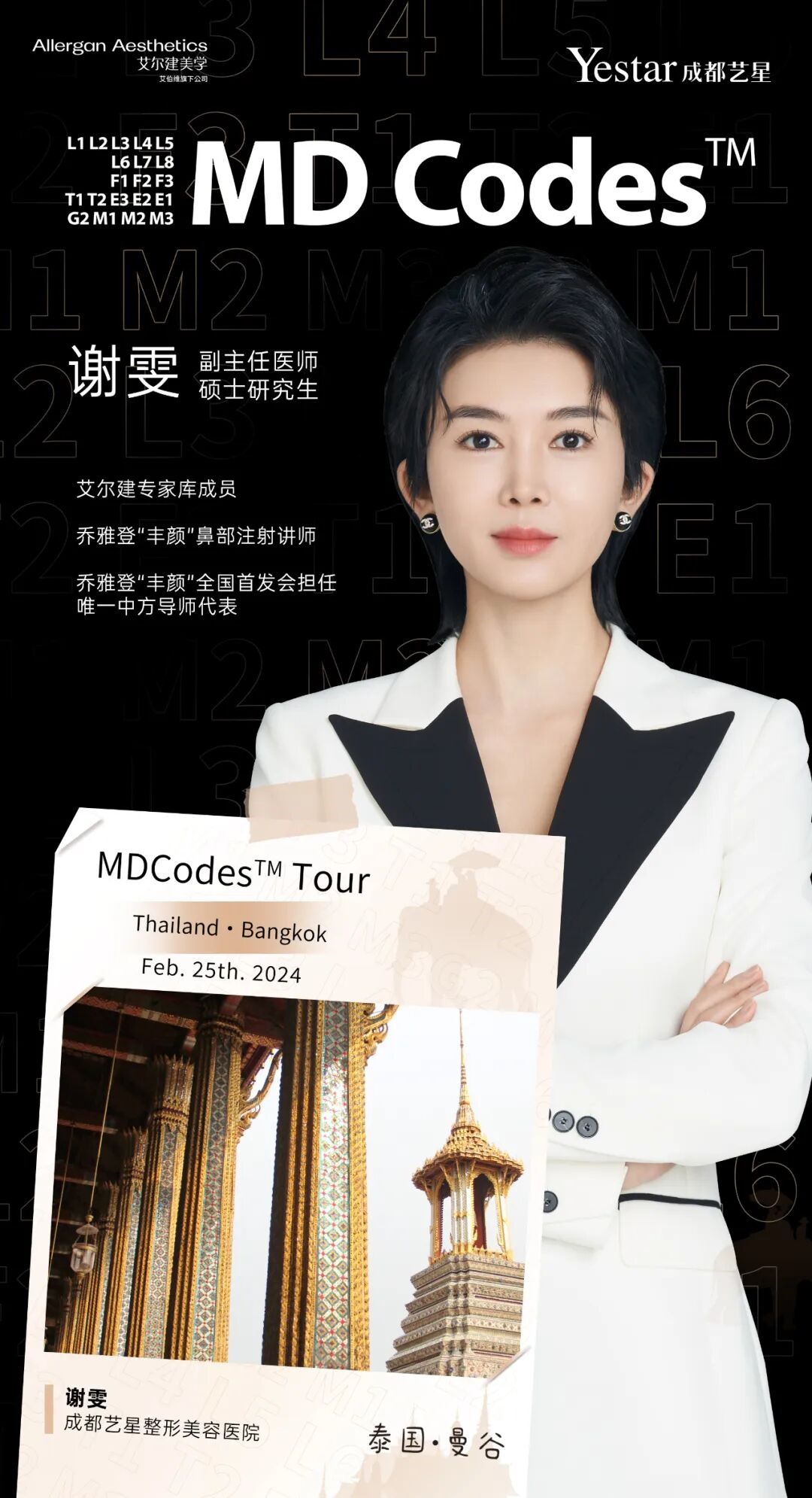 2024年2月25-29日,艾尔建美学于泰国曼谷精彩呈现2024 MD Codes™Live Tour,成都艺星美容注射中心院长谢雯女士受邀出席。此次国际美学盛会携手亚太地区超500名注射专家,与世界著名整形外科医生、乔雅登注射大师、MD Codes™创始人Dr.Mauricio De Maio博士共同解锁情绪美学密码,探讨定制化、个性化的美学方案。