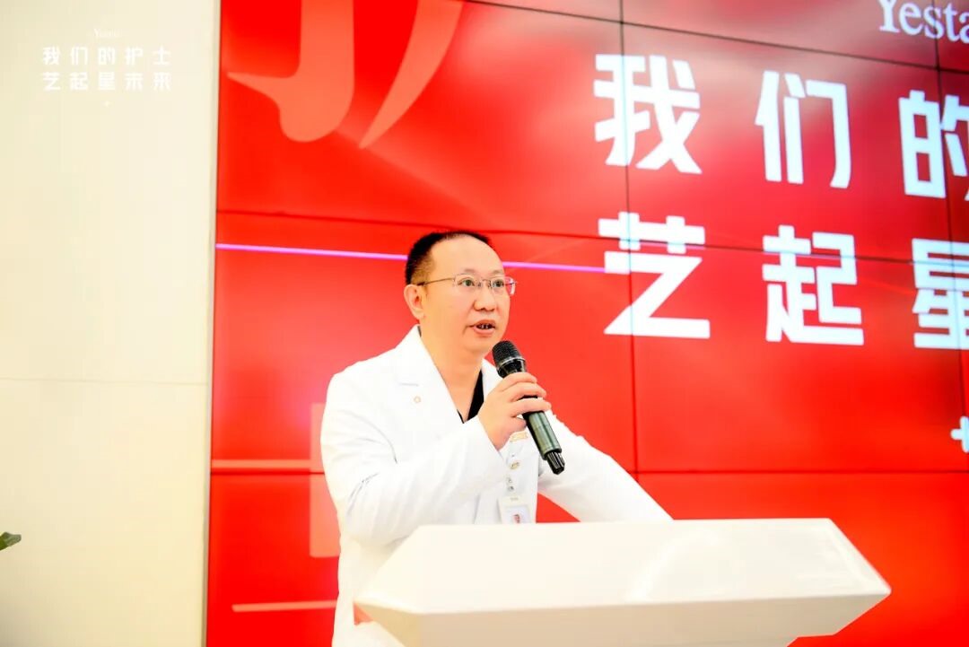 医疗院长王斌先生上台致辞并代表护理部向在场所有护理人员表示节日的祝贺,成都艺星护理团队的发展壮大离不开每位护理人员,王院激励在场护士同仁,希望大家能够秉持初心,担当护理职责,发挥自己的护理技能,携手团队,共同进步,为顾客带去更优质的护理体验。