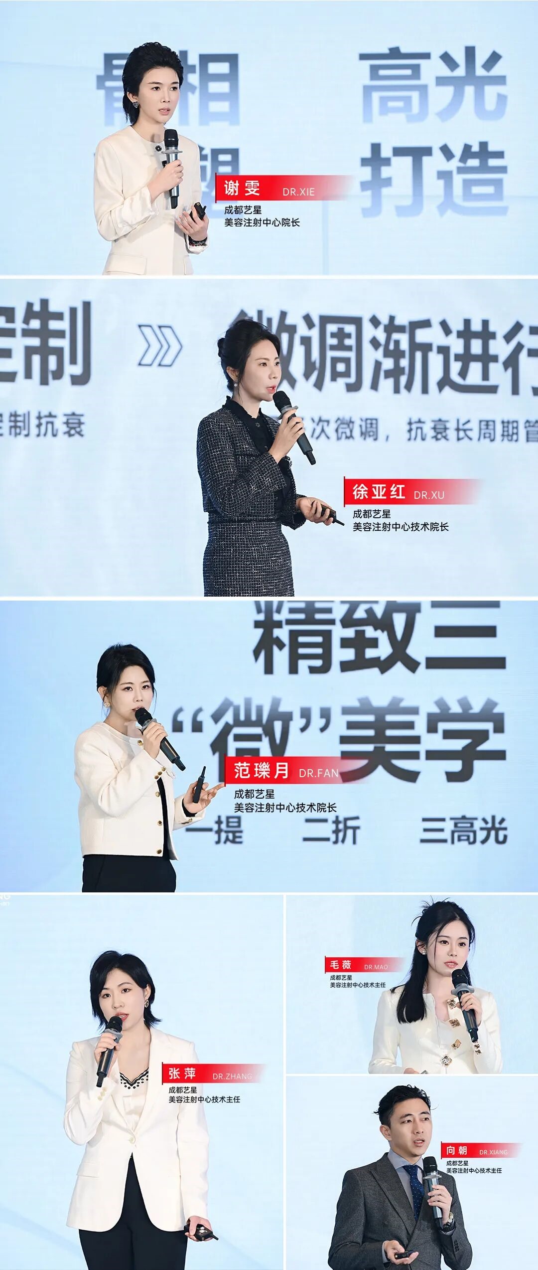 江苏吴中美学总经理项臻,江苏吴中美学市场部产品经理潘梦溪,小红书商业医美行业经理木透,艺星集团医管部总监潘竹林,成都艺星总经理张进,成都艺星美容注射中心院长谢雯,成都艺星院长、成都艺星美容注射中心技术院长徐亚红,成都艺星美容皮肤科院长朱紫婷,成都艺星美容注射中心技术院长范瓅月,成都艺星美容皮肤科技术院长杨海皎,成都艺星整形外科技术院长周顺波,成都艺星整形外科技术院长李竞,成都艺星整形外科技术院长韩春、成都艺星星美学概念院院长王强等重要领导及专家医生出席现场。