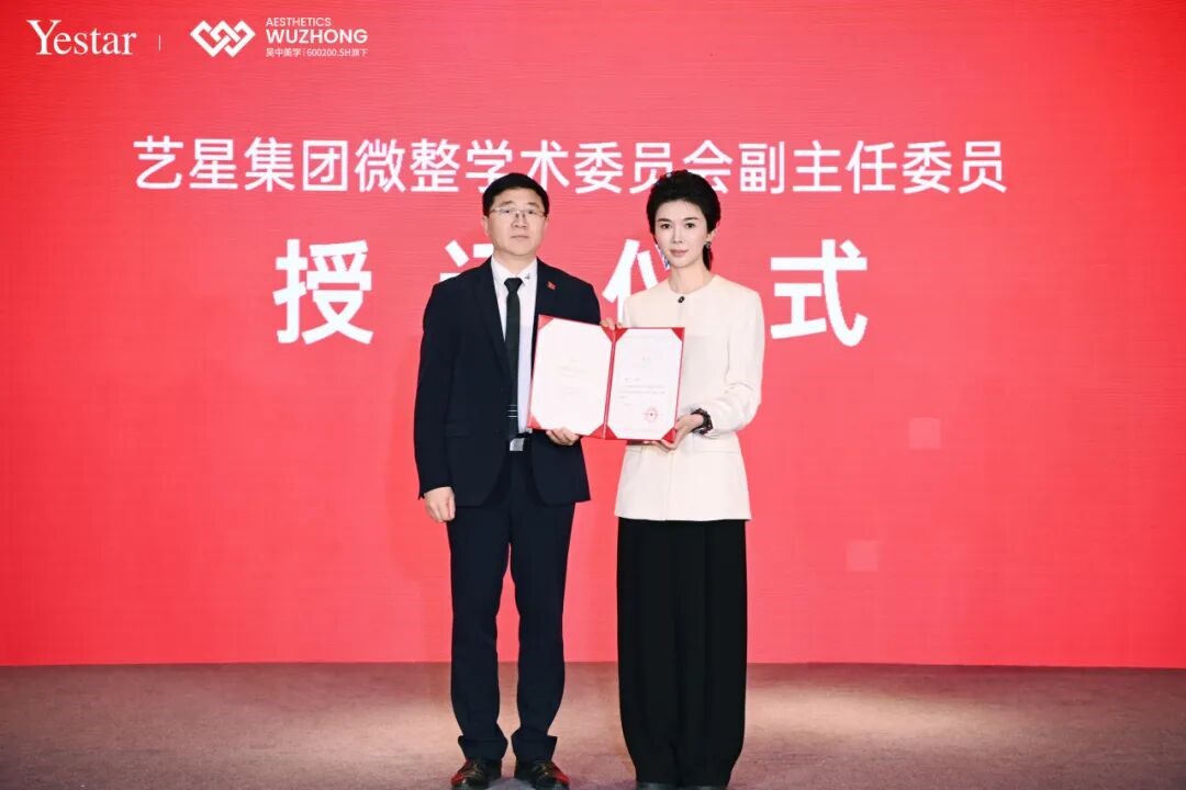 随后,潘总为成都艺星美容注射中心院长谢雯颁发艺星集团微整学术委员会副主任委员证书。谢雯院长作为成都艺星微整注射领域的领头人,在美学探索、技术创研、学术革新等方面都有着深远卓识。此次艺星集团微整学术委员会的授证,不但是艺星集团对谢雯院长个人专业成就的肯定与认可,也代表着谢雯院长引领的成都艺星美容注射中心,在推动微整行业学术进步和技术臻研等层面做出了卓越贡献。